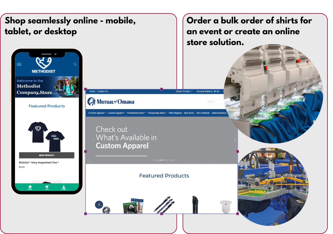 Create a company or organization store and make it easy for your users to shop and purchase custom apparel, promotional items, or print. They’re free, and our Omaha team will create an online shop for you!